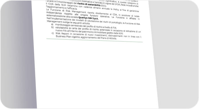 POLICY RISK MANAGEMENT Nell’ambito delle attività aziendali, Redo redige, attua e mantiene aggiornata una Policy di gestione del rischio (Policy), che consente di individuare tutti i pertinenti rischi ai quali i FIA immobiliari chiusi gestiti dalla SGR sono esposti o potrebbero essere esposti. La Policy include la descrizione degli strumenti e delle procedure necessarie per permettere alla SGR di valutare, per ogni FIA che gestisce, l’esposizione al rischio di mercato, di liquidità, di credito, di controparte, nonché l’esposizione a qualsiasi altro rischio pertinente, compreso il rischio operativo, che potrebbe assumere un impatto significativo. A queste categorie di rischio, in linea con le disposizioni normative e l’entrata in vigore del SFDR, Redo include anche l’analisi e il monitoraggio del rischio di sostenibilità (ESG). Il CDA della SGR riesamina con cadenza almeno annuale la Policy al fine di garantirne l’aggiornamento e l’efficacia. La Funzione di Risk Management riporta direttamente al CDA, in posizione di totale indipendenza rispetto alle singole funzioni operative. La Funzione è affidata in esternalizzazione alla società Quantyx SIM S.p.A. Nell’implementazione dei modelli di valutazione dei rischi di portafoglio, la Funzione di Risk Management svolge le seguenti attività: a) monitoraggio semestrale del profilo di rischio a livello di FIA; b) valutazione ex ante del profilo di rischio potenziale in occasione di istituzione di un nuovo FIA all’interno del patrimonio immobiliare gestito dalla SGR; c) Risk Report in occasione di nuovi investimenti, disinvestimenti non in linea con il Business Plan vigente, aggiornamento del Piano di Attività. 11