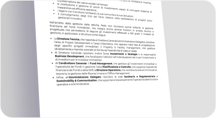 art.9 SFDR) e quindi effettuati nel rispetto dei princìpi di sostenibilità sociale e ambientale e degli obiettivi di decarbonizzazione dell’Unione Europea4 . Con riferimento al modello organizzativo, Redo cura: la solidità economico-finanziaria delle iniziative realizzate; il modello di progettazione e sviluppo immobiliare pensato per essere sostenibile nel lungo termine; lo sviluppo di progetti complessi, con la partnership strategica di Fondazione Housing Sociale; la preservazione del valore sociale nel tempo; la costituzione e gestione di veicoli di investimento capaci di coniugare esigenze di trasparenza ed efficacia operativa; i legami con il territorio lombardo, le sue comunità e le sue istituzioni; il coinvolgimento degli Enti del Terzo Settore nella realizzazione di progetti socio- gestionali innovativi. Nell’ambito della gestione delle attività, Redo non incorpora quindi soltanto la gestione finanziaria dei fondi immobiliari, ma integra anche diverse funzioni in ambito tecnico e progettuale che permettono di seguire gli investimenti effettuati a 360 gradi. Il modello di gestione, in particolare, si struttura come segue: • La Direzione Tecnica, che risponde al Direttore Generale (Amministratore Delegato), coordina: l’area di Project Development e l’area Urbanistica, che operano nella fase di progettazione degli specifici progetti immobiliari; il Property & Facility management, che gestisce (direttamente o tramite contratti di fornitura) l’operatività di ciascun asset. • Al Direttore Generale riportano inoltre l’area Investimenti e Strategie e la responsabile Business Development, che focalizzano l’attività nell’individuazione dei nuovi investimenti e di investitori per le iniziative immobiliari. • Al Condirettore Generale: il Fund Management, che gestisce gli investimenti immobiliari e l’operatività dei Fondi in gestione; l’area Pianificazione e Controllo, che supporta l’operatività finanziaria dei Fondi e della SGR; la Direzione Operations, che coordina le aree amministrative, tesoreria, la gestione delle Risorse Umane e l’Office Management. • Infine, all’Amministratore Delegato riportano le aree Societario e Regolamentare e Sustainability & Communication, che supportano trasversalmente l’operatività delle funzioni operative e amministrative. 4 Per maggiori informazioni si rimanda al Capitolo 3.4 della presente relazione. 9