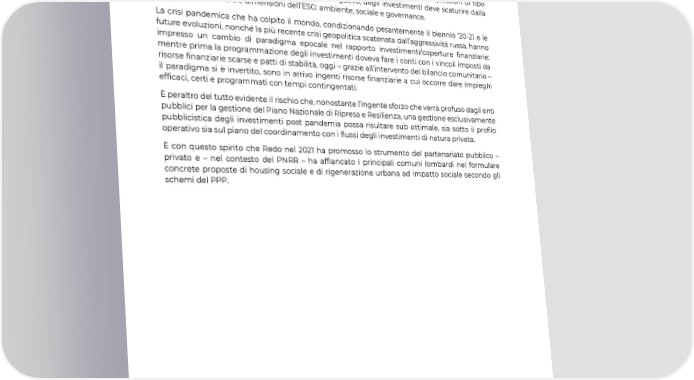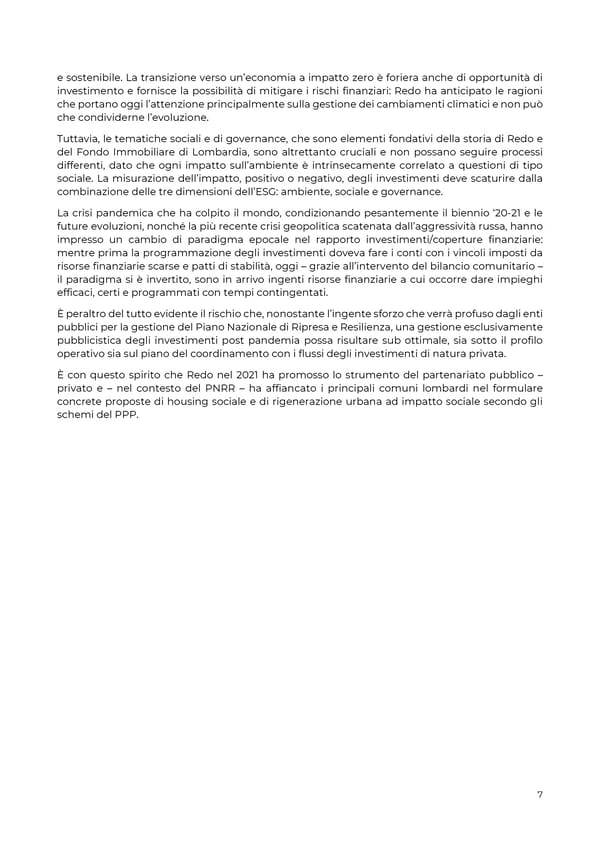 e sostenibile. La transizione verso un’economia a impatto zero è foriera anche di opportunità di investimento e fornisce la possibilità di mitigare i rischi finanziari: Redo ha anticipato le ragioni che portano oggi l’attenzione principalmente sulla gestione dei cambiamenti climatici e non può che condividerne l’evoluzione. Tuttavia, le tematiche sociali e di governance, che sono elementi fondativi della storia di Redo e del Fondo Immobiliare di Lombardia, sono altrettanto cruciali e non possano seguire processi differenti, dato che ogni impatto sull’ambiente è intrinsecamente correlato a questioni di tipo sociale. La misurazione dell’impatto, positivo o negativo, degli investimenti deve scaturire dalla combinazione delle tre dimensioni dell’ESG: ambiente, sociale e governance. La crisi pandemica che ha colpito il mondo, condizionando pesantemente il biennio ‘20-21 e le future evoluzioni, nonché la più recente crisi geopolitica scatenata dall’aggressività russa, hanno impresso un cambio di paradigma epocale nel rapporto investimenti/coperture finanziarie: mentre prima la programmazione degli investimenti doveva fare i conti con i vincoli imposti da risorse finanziarie scarse e patti di stabilità, oggi – grazie all’intervento del bilancio comunitario – il paradigma si è invertito, sono in arrivo ingenti risorse finanziarie a cui occorre dare impieghi efficaci, certi e programmati con tempi contingentati. È peraltro del tutto evidente il rischio che, nonostante l’ingente sforzo che verrà profuso dagli enti pubblici per la gestione del Piano Nazionale di Ripresa e Resilienza, una gestione esclusivamente pubblicistica degli investimenti post pandemia possa risultare sub ottimale, sia sotto il profilo operativo sia sul piano del coordinamento con i flussi degli investimenti di natura privata. È con questo spirito che Redo nel 2021 ha promosso lo strumento del partenariato pubblico – privato e – nel contesto del PNRR – ha affiancato i principali comuni lombardi nel formulare concrete proposte di housing sociale e di rigenerazione urbana ad impatto sociale secondo gli schemi del PPP. 7