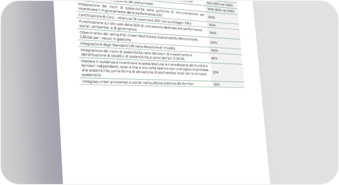 studenti e ai ricercatori. Nel 2021 sono stati svolti oltre 15 tra lavori di ricerca pubblicati su importanti riviste scientifiche, tesi di laurea, lavori di gruppo, project work dei master, che hanno visto coinvolti oltre 40 tra studenti, ricercatori e professori. OBIETTIVI 2021 STATO Realizzazione di una app dedicata ai conduttori e agli abitanti nei quartieri degli 100% (50% nel 2020) interventi del FIL gestiti da Redo Sperimentazione di soluzioni innovative per la deep renovation e l’off-site 50% (30% nel 2020) Progetti innovativi a supporto dei policymaker 100% (50% nel 2020) Integrazione dei rischi di sostenibilità nelle politiche di remunerazione per 100% incentivare il miglioramento delle performance ESG Certificazione B Corp – ottenuta l’8 novembre 2021 con punteggio 106.2 100% Pubblicazione sul sito web della SGR di una sezione dedicata alle performance 100% sociali, ambientali e di governance. Ottenimento del rating ESG Green Real Estate Sustainability Benchmarks 100% GRESB per i veicoli in gestione Integrazione degli Standard GRI nella Relazione di Impatto 100% Integrazione dei rischi di sostenibilità nelle decisioni di investimento e 80% identificazione di obiettivi di sostenibilità ai sensi dell’art. 9 SFDR Mettere in evidenza e incentivare la spesa (esclusa la manodopera) attribuibile a fornitori indipendenti, locali e che a loro volta operino con una logica improntata 20% alla sostenibilità, come forma di attivazione di partnership locali per lo sviluppo sostenibile Integrare criteri ambientali e sociali nell’audit/valutazione dei fornitori 50% 28