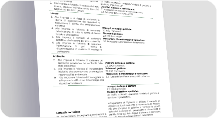 Appendice 5. United Nations Global Compact La Relazione di Impatto 2021 rappresenta la prima Communication on Progress in relazione ai 10 Principi del Global Compact delle Nazioni Unite cui la Società è segnataria da maggio 2021. Principi UNGC Redo Diritti Umani Impegni, strategie e politiche: 1. Alle imprese è richiesto di promuovere e 2.2. ESG Framework rispettare i diritti umani universalmente Sistema di gestione: riconosciuti nell'ambito delle rispettive 2.1. Profilo societario – paragrafo “Modello di gestione e sfere di influenza struttura organizzativa” 2. Alle imprese è richiesto di assicurarsi di non Obiettivi, iniziative e performance: essere, seppure indirettamente, complici 3.1. Accessibilità e inclusione socioeconomica; negli abusi dei diritti umani 3.2. Sviluppo delle comunità e ETS. Lavoro 3. Alle imprese è richiesto di sostenere la libertà di associazione dei lavoratori e riconoscere il diritto alla contrattazione collettiva Impegni, strategie e politiche: 4. Alle imprese è richiesto di sostenere 2.2. ESG Framework l'eliminazione di tutte le forme di lavoro Sistema di gestione: forzato e obbligatorio 2.2. ESG Framework 5. Alle imprese è richiesto di sostenere Meccanismi di monitoraggio e valutazione: l'effettiva eliminazione del lavoro minorile 3.5. Benessere e valorizzazione delle persone 6. Alle imprese è richiesto di sostenere l'eliminazione di ogni forma di discriminazione in materia di impiego e professione Ambiente 7. Alle imprese è richiesto di sostenere un Impegni, strategie e politiche: approccio preventivo nei confronti delle sfide ambientali 2.2. ESG Framework 8. Alle imprese è richiesto di intraprendere Sistema di gestione: iniziative che promuova no una maggiore 2.2. ESG Framework responsabilità ambientale Meccanismi di monitoraggio e valutazione: 9. Alle imprese è richiesto di incoraggiare lo 3.3. Tutela dell’ambiente e neutralità carbonica sviluppo e la diffusione di tecnologie che rispettino l'ambiente Impegni, strategie e politiche 2.2. ESG Framework Modello di gestione e politiche: 2.1. Profilo societario – paragrafo “Modello di gestione e struttura organizzativa”. All’organismo di Vigilanza è affidato il compito di vigilare sul funzionamento e l’osservanza del Modello Lotta alla corruzione 231, che disciplina le politiche e monitora le attività 10. Le imprese si impegnano a contrastare la aziendali in merito alla prevenzione e al contrasto di corruzione in ogni sua forma, incluse atti illeciti tra cui il riciclaggio di denaro, la corruzione, l'estorsione e le tangenti etc. ed è consultabile sul sito web dell’azienda. Meccanismi di monitoraggio e valutazione: Nell’anno di riferimento sono state svolte 160 ore totali di corsi di formazione in ambito antiriciclaggio e MOG 231 che hanno interessato 35 persone (la totalità dei 32 dipendenti e due lavoratori non dipendenti) [GRI 205-2]; Nell’anno di riferimento non si segnalano episodi di corruzione accertati da parte di dipendenti e amministratori di Redo [GRI 205-3]. 40