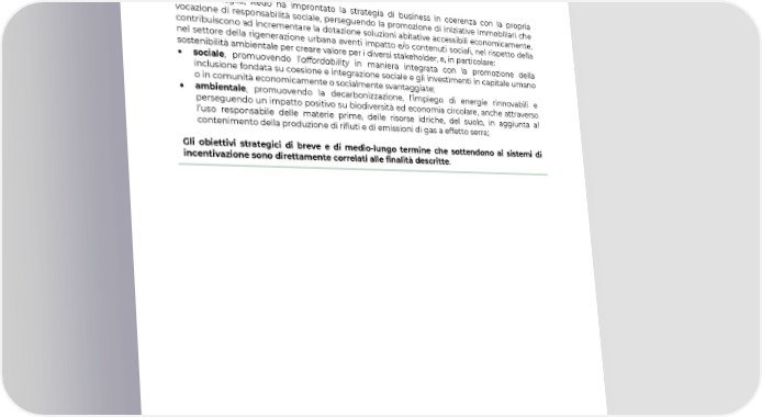 RISCHI DI SOSTENIBILITÀ NELLA POLITICA DI REMUNERAZIONE E INCENTIVAZIONE La Politica è volta a incentivare il perseguimento degli obiettivi annuali e pluriennali, così come delineati nella strategia di medio-lungo termine e a contribuire alla creazione di valore condiviso per la Società e i suoi azionisti, nonché per tutti gli stakeholder. In particolare, la strategia sostenibile di Redo mira alla creazione di valore attraverso, tra l’altro, l’integrazione dei SDGs e dei fattori ESG rilevanti nell’ambito di attività della SGR e dei FIA gestiti. Più in dettaglio, Redo ha improntato la strategia di business in coerenza con la propria vocazione di responsabilità sociale, perseguendo la promozione di iniziative immobiliari che contribuiscono ad incrementare la dotazione soluzioni abitative accessibili economicamente, nel settore della rigenerazione urbana aventi impatto e/o contenuti sociali, nel rispetto della sostenibilità ambientale per creare valore per i diversi stakeholder, e, in particolare: • sociale, promuovendo l’affordability in maniera integrata con la promozione della inclusione fondata su coesione e integrazione sociale e gli investimenti in capitale umano o in comunità economicamente o socialmente svantaggiate; • ambientale, promuovendo la decarbonizzazione, l’impiego di energie rinnovabili e perseguendo un impatto positivo su biodiversità ed economia circolare, anche attraverso l’uso responsabile delle materie prime, delle risorse idriche, del suolo, in aggiunta al contenimento della produzione di rifiuti e di emissioni di gas a effetto serra; Gli obiettivi strategici di breve e di medio-lungo termine che sottendono ai sistemi di incentivazione sono direttamente correlati alle finalità descritte. 19