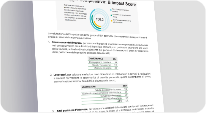 4. Valutazione di impatto 2021 Nel mese di novembre 2021 Redo ha ultimato il processo di validazione e verifica del B Impact Assessment, ottenendo quindi la certificazione B Corp. Il B Impact Score finale attribuito a Redo a esito della valutazione di impatto 2021 è pari a 106.2, di oltre 5 punti superiore al pre-assessment del 2020 e di gran lunga superiore alla media del punteggio delle società italiane e globali22 . La valutazione dell’impatto condotta grazie al BIA permette di comprendere le seguenti aree di analisi ai sensi della normativa italiana: 1. Governance dell’impresa, per valutare il grado di trasparenza e responsabilità della Società nel perseguimento delle finalità di beneficio comune, con particolare attenzione allo scopo della Società, al livello di coinvolgimento dei portatori d’interesse, e al grado di trasparenza delle politiche e delle pratiche adottate dalla società; GOVERNANCE 20,1 Proteggere la missione 10 Etica & Trasparenza 7,6 Mission e impegno 2,5 2. Lavoratori, per valutare le relazioni con i dipendenti e i collaboratori in termini di retribuzioni e benefit, formazione e opportunità di crescita personale, qualità dell’ambiente di lavoro, comunicazione interna, flessibilità e sicurezza del lavoro; LAVORATORI 28,0 Salute, benessere, sicurezza 7,8 Livello di coinvolgimento e soddisfazione 5,5 Sviluppo professionale 5,0 Sicurezza finanziaria 1,9 Altro 7,6 3. Altri portatori d’interesse, per valutare le relazioni della società con i propri fornitori, con il territorio e le comunità locali in cui opera, le azioni di volontariato, le donazioni, le attività culturali e sociali, e ogni azione di supporto allo sviluppo locale e della propria catena di fornitura; 22 Secondo il primo Report delle B Corp in Italia, nel 2021 ben 3.600 aziende hanno utilizzato il B Impact Assessment per misurare il proprio impatto. Nel 2021 la media del punteggio delle società B Corp italiane è stata 91,6. La media globale si attesta a 88,9 punti (fonte: https://unlockthechange.it/il-primo-report-delle-b- corp/) 31