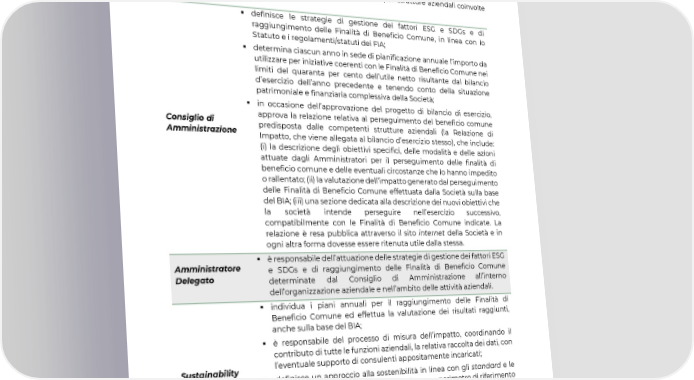 Ruoli e governance ESG Il sistema di governance ad oggi istituito per la gestione dei rischi di sostenibilità e responsabilità sociale a tutti i livelli di gestione ha previsto l’istituzione del ruolo di un Sustainability Manager e Responsabile dell’Impatto, a diretto riporto dell’Amministratore Delegato, al quale sono stati affidati, unitamente al Consiglio di Amministrazione e all’Amministratore Delegato della Società –, le funzioni e i compiti relativi al perseguimento delle Finalità di Beneficio Comune. Più in dettaglio, le principali funzioni degli organi e delle principali strutture aziendali coinvolte sono le seguenti: definisce le strategie di gestione dei fattori ESG e SDGs e di raggiungimento delle Finalità di Beneficio Comune, in linea con lo Statuto e i regolamenti/statuti dei FIA; determina ciascun anno in sede di pianificazione annuale l’importo da utilizzare per iniziative coerenti con le Finalità di Beneficio Comune nei limiti del quaranta per cento dell’utile netto risultante dal bilancio d’esercizio dell’anno precedente e tenendo conto della situazione patrimoniale e finanziaria complessiva della Società; in occasione dell’approvazione del progetto di bilancio di esercizio, Consiglio di approva la relazione relativa al perseguimento del beneficio comune Amministrazione predisposta dalle competenti strutture aziendali (la Relazione di Impatto, che viene allegata al bilancio d’esercizio stesso), che include: (i) la descrizione degli obiettivi specifici, delle modalità e delle azioni attuate dagli Amministratori per il perseguimento delle finalità di beneficio comune e delle eventuali circostanze che lo hanno impedito o rallentato; (ii) la valutazione dell’impatto generato dal perseguimento delle Finalità di Beneficio Comune effettuata dalla Società sulla base del BIA; (iii) una sezione dedicata alla descrizione dei nuovi obiettivi che la società intende perseguire nell’esercizio successivo, compatibilmente con le Finalità di Beneficio Comune indicate. La relazione è resa pubblica attraverso il sito internet della Società e in ogni altra forma dovesse essere ritenuta utile dalla stessa. è responsabile dell’attuazione delle strategie di gestione dei fattori ESG Amministratore e SDGs e di raggiungimento delle Finalità di Beneficio Comune Delegato determinate dal Consiglio di Amministrazione all’interno dell’organizzazione aziendale e nell’ambito delle attività aziendali. individua i piani annuali per il raggiungimento delle Finalità di Beneficio Comune ed effettua la valutazione dei risultati raggiunti, anche sulla base del BIA; è responsabile del processo di misura dell’impatto, coordinando il contributo di tutte le funzioni aziendali, la relativa raccolta dei dati, con Sustainability l’eventuale supporto di consulenti appositamente incaricati; Manager e definisce un approccio alla sostenibilità in linea con gli standard e le Responsabile best practice internazionali, prendendo come perimetro di riferimento dell’Impatto gli SDGs, e dà attuazione a iniziative coerenti con le Finalità di Beneficio Comune e per la valorizzazione degli impatti sociali e ambientali integrati nelle attività delle strutture aziendali; attua iniziative per il miglioramento delle performance ESG e dell’efficacia nell’applicazione dei princìpi di sostenibilità; cura, tramite comunicazione interna ed esterna, la diffusione della cultura della Società e dei suoi approcci tesi alla creazione di valore 17