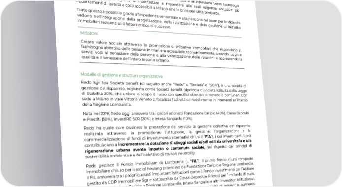 2. Redo 2.1. Profilo societario Siamo il primo gestore di fondi immobiliari impegnato nella creazione di spazi abitativi che siano allo stesso tempo di qualità ed economicamente sostenibili per le persone: il nostro focus è l’Affordable Housing. Grazie a un costante monitoraggio delle ricerche di settore e all’attenzione verso tecnologie innovative, siamo in grado di intercettare e rispondere alle reali esigenze abitative: più appartamenti di qualità a costi accessibili a Milano e nelle principali città lombarde. Tutto questo è possibile grazie all’esperienza ventennale e alla passione del team per le sfide che vedono nell’integrazione della progettazione, della realizzazione e della gestione di iniziative immobiliari residenziali il fattore critico di successo. MISSION Creare valore sociale attraverso la promozione di iniziative immobiliari che rispondano al fabbisogno abitativo delle persone in maniera accessibile economicamente, creando luoghi e servizi volti al benessere delle persone e alla valorizzazione delle relazioni e accrescendo la qualità e il benessere dell’intero tessuto urbano. Modello di gestione e struttura organizzativa Redo Sgr Spa Società benefit (di seguito anche “Redo” o “Società” o “SGR”), è una società di gestione del risparmio, registrata come Società Benefit (tipologia di società istituita dalla Legge di Stabilità 2016, che unisce lo scopo di lucro con specifici obiettivi di beneficio comune3 ). Con sede a Milano in viale Vittorio Veneto 2, focalizza l’attività di investimento in interventi all’interno della Regione Lombardia. Nata nel 2019, Redo oggi annovera tra i propri azionisti Fondazione Cariplo (40%), Cassa Depositi e Prestiti (30%), InvestiRE SGR (20%) e Intesa Sanpaolo (10%). Redo ha quale core business la prestazione del servizio di gestione collettiva del risparmio realizzata attraverso la promozione, l’istituzione, la gestione, l’organizzazione e la commercializzazione di fondi di investimento alternativi chiusi (i “FIA”), i cui investimenti tipici contribuiscano a incrementare la dotazione di alloggi sociali e/o di edilizia universitaria e alla rigenerazione urbana avente impatto o contenuto sociale, nel rispetto dei princìpi di sostenibilità ambientale e dell’obiettivo di carbon neutrality. Redo gestisce il Fondo Immobiliare di Lombardia (il “FIL”), il primo fondo multi comparto immobiliare chiuso per il social housing promosso da Fondazione Cariplo e Regione Lombardia. Il FIL annovera tra i propri quotisti importanti istituzioni come il Fondo Investimenti per l’Abitare gestito da CDP Immobiliare Sgr e sottoscritto da Cassa Depositi e Prestiti per 1 miliardo di euro, le stesse Fondazione Cariplo e Regione Lombardia, Intesa Sanpaolo e altri investitori istituzionali. Il FIL aderisce alla Fondazione Housing Sociale, la quale svolge attività di advisor in numerosi progetti immobiliari del Fondo. Nel 2021, è stato inoltre lanciato il nuovo FIA City Regeneration Fund (RE-City), il primo fondo immobiliare che ha come scopo l’investimento sostenibile attraverso le iniziative immobiliari realizzate, in linea con i requisiti richiesti dal Regolamento UE 2019/2088 (cosiddetto Fondo ex 3 Si rimanda al paragrafo “Pilastri” del Capitolo 2.2. ESG Framework per maggiori informazioni. 8