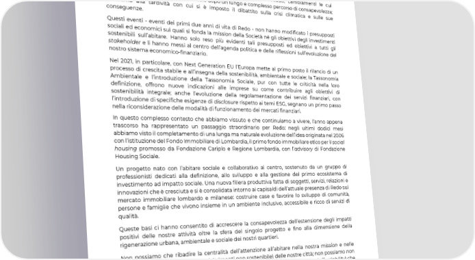 Lettera agli Stakeholder Gli eventi imprevisti degli ultimi due anni, una crisi economica, una crisi politica, una pandemia, una guerra percepita più vicina delle altre, sono stati caratterizzati da una radicalità che ha colto tutti alla sprovvista nella loro drammatica evidenza; la pandemia, in particolare, ha messo a dura prova le nostre sicurezze più profonde, in discussione il nostro modo di lavorare e di abitare, trasformando tempi e luoghi della vita familiare e civile. Una situazione affatto diversa rispetto ai cambiamenti continui ma impercettibili cui ormai eravamo abituati, cambiamenti le cui conseguenze diventavano evidenti solo dopo un lungo e complesso percorso di consapevolezza; pensiamo alla tardività con cui si è imposto il dibattito sulla crisi climatica e sulle sue conseguenze. Questi eventi - eventi dei primi due anni di vita di Redo - non hanno modificato i presupposti sociali ed economici sui quali si fonda la mission della Società né gli obiettivi degli investimenti sostenibili sull’abitare. Hanno solo reso più evidenti tali presupposti ed obiettivi a tutti gli stakeholder e li hanno messi al centro dell’agenda politica e delle riflessioni sull’evoluzione del nostro sistema economico-finanziario. Nel 2021, in particolare, con Next Generation EU l’Europa mette al primo posto il rilancio di un processo di crescita stabile e all’insegna della sostenibilità, ambientale e sociale; la Tassonomia Ambientale e l’introduzione della Tassonomia Sociale, pur con tutte le criticità nella loro definizione, offrono nuove indicazioni alle imprese su come contribuire agli obiettivi di sostenibilità integrale; anche l’evoluzione della regolamentazione dei servizi finanziari, con l’introduzione di specifiche esigenze di disclosure rispetto ai temi ESG, segnano un primo passo nella riconsiderazione delle modalità di funzionamento dei mercati finanziari. In questo complesso contesto che abbiamo vissuto e che continuiamo a vivere, l’anno appena trascorso ha rappresentato un passaggio straordinario per Redo: negli ultimi dodici mesi abbiamo visto il completamento di una lunga ma naturale evoluzione dell’idea originata nel 2006 con l’istituzione del Fondo Immobiliare di Lombardia, il primo fondo immobiliare etico per il social housing promosso da Fondazione Cariplo e Regione Lombardia, con l’advisory di Fondazione Housing Sociale. Un progetto nato con l’abitare sociale e collaborativo al centro, sostenuto da un gruppo di professionisti dedicati alla definizione, allo sviluppo e alla gestione del primo ecosistema di investimento ad impatto sociale. Una nuova filiera produttiva fatta di soggetti, servizi, relazioni e innovazioni che è cresciuta e si è consolidata intorno ai capisaldi dell’attuale presenza di Redo sul mercato immobiliare lombardo e milanese: costruire case e favorire lo sviluppo di comunità, persone e famiglie che vivono insieme in un ambiente inclusivo, accessibile e ricco di servizi di qualità. Queste basi ci hanno consentito di accrescere la consapevolezza dell’estensione degli impatti positivi delle nostre attività oltre la sfera del singolo progetto e fino alla dimensione della rigenerazione urbana, ambientale e sociale dei nostri quartieri. Non possiamo che ribadire la centralità dell’attenzione all’abitare nella nostra mission e nelle politiche dello sviluppo inclusivo (altrimenti non sostenibile) delle nostre città; non possiamo non avere in mente l’obiettivo della sostenibilità economica delle soluzioni abitative (affordability) che proponiamo agli inquilini e agli acquirenti delle abitazioni che realizziamo; non possiamo non sottolineare quanto essenziale sia la valorizzazione delle relazioni fra le persone e la creazione di comunità sostenibili. Per questo non possiamo non essere anche consapevoli della responsabilità più ampia che abbiamo sulla scala degli spazi della città, responsabilità da esercitarsi mettendo al centro il beneficio comune e il coinvolgimento di tutti gli stakeholder nel momento della definizione della sostenibilità complessiva degli investimenti. Gli investimenti dei fondi immobiliari da noi gestiti, l’evoluzione e l’innovazione dei rapporti con le amministrazioni locali, le nuove reti organizzative e digitali che coinvolgono abitanti, gestori, 3
