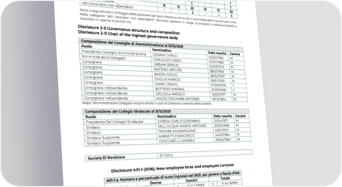 Appendice 2. Tabelle indicatori GRI e non GRI General Disclosure 2-7 – Employees; General Disclosure 2-8 – Workers who are not employees HC al 31 dicembre 2020 2021 Donne Uomini Totale Donne Uomini Totale Dipendenti full-time a tempo indeterminato 10 11 21 14 16 30 Dipendenti full-time a tempo determinato - - - - 1 1 Dipendenti full-time in apprendistato 1 - 1 1 - 1 Totale dipendenti 11 11 22 15 17 32 Altri lavoratori non dipendenti 1 1 2 1 2 3 Nota: si segnala che il conteggio delle persone è per testa (head count) e non ci sono dipendenti assunti part-time. Nella categoria “altri lavoratori non dipendenti” rientrano persone in stage (curricolare o extracurricolare) e lavoratori in regime di partita IVA. Disclosure 2-9 Governance structure and composition Disclosure 2-11 Chair of the highest governance body Composizione del Consiglio di Amministrazione al 31/12/2021 Ruolo Nominativo Data nascita Genere Presidente Consiglio Amministrazione CERAMI CARLO 02/02/1965 M Amministratore Delegato CARLOZZO FABIO 01/07/1968 M Consigliere URBANI SERGIO 03/03/1972 M Consigliere NATTINO ARTURO 28/01/1964 M Consigliere BASTIA GIULIO 28/02/1957 M Consigliere DOGLIO MARCO 29/01/1959 M Consigliere DARIA CIRIACI 07/03/1976 F Consigliere indipendente BOTTERO MARINA 27/09/1960 F Consigliere indipendente GIGLIOLA ANGELO 12/05/1977 M Consigliere indipendente MAZZA GIOVANNI ANTONIO 16/12/1964 M Nota: l’Amministratore Delegato ricopre anche il ruolo di Direttore Generale della Società. Composizione del Collegio Sindacale al 31/12/2021 Ruolo Nominativo Data nascita Genere Presidente Del Collegio Sindacale CARDIA CARLO GERONIMO 01/04/1971 M Sindaco DELL'ACQUA MARCO ANTONIO 29/05/1966 M Sindaco TROIANI MASSIMILIANO 10/01/1972 M Sindaco Supplente MINNETTI FRANCESCO 24/01/1964 M Sindaco Supplente CIOCCARELLI ANDREA 29/04/1964 M Società Di Revisione EY S.P.A. Disclosure 401-1 (2016): New employee hires and employee turnover 401-1 a. Numero e percentuale di nuovi ingressi nel 2021, per genere e fascia d’età Fascia d’età Donne Uomini Totale n. % sul totale n. % sul totale n. % sul totale Under 30 3 9% 4 13% 7 22% Tra 30 e 50 - - 3 9% 3 9% Over 30 1 3% 1 3% 2 6% Totale 4 13% 8 25% 12 38% 35