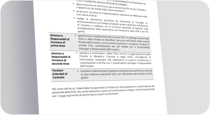 sociale attraverso la promozione dell’affordable housing, della rigenerazione urbana, nel rispetto dell’ambiente e delle comunità; collabora con le altre strutture aziendali nell’identificazione di nuove opportunità e partner, nelle iniziative di scouting e ricerca di soluzioni innovative e nuovi business model coerenti agli obiettivi di sostenibilità e impatto sociale connessi agli investimenti della Società, anche in nome e per conto dei FIA; supporta le attività di reporting, di rendicontazione non finanziaria e di relazioni pubbliche dell’Amministratore Delegato; agisce da punto di riferimento per le tematiche ESG e cura il dialogo e i rapporti con gli stakeholder interni ed esterni; propone e coordina le implementazioni operative da effettuare sulla normativa interna; redige la reportistica periodica da presentare al Consiglio di Amministrazione e al Collegio sindacale, quale, a esempio, la Relazione di Impatto, e collabora con le strutture aziendali competenti nella predisposizione della reportistica non finanziaria della SGR e dei FIA gestiti. Direttori e garantiscono l’applicazione dei princìpi ESG e il perseguimento degli Responsabili di SDGs e delle Finalità di Beneficio Comune nell’ambito della propria Funzione di Direzione/Funzione, comunicando le attività e i progressi compiuti in prima linea ambito ESG, coordinandosi per tali finalità con il Sustainability Manager e Responsabile dell’Impatto. Direttori e valutano e monitorano i fattori ESG, nonché il raggiungimento delle Responsabili di Finalità di Beneficio Comune e degli SDGs, raccogliendo le Funzione di informazioni necessarie alla reportistica di propria competenza e seconda linea coordinandosi a tal fine con il Sustainability Manager e Responsabile dell’Impatto. Funzioni includono nelle attività di rispettiva competenza le verifiche ex ante ed Aziendali di ex post relative ai parametri ESG, con riferimento alla Società e ai FIA Controllo gestiti. Nel corso dell’anno l’Assemblea ha approvato la Politica di remunerazione e incentivazione del personale della SGR, che, anche attraverso il piano di incentivazione, integra i rischi di sostenibilità per il raggiungimento di performance sociali e ambientali11. 11 Per maggiori informazioni si rimanda al Capitolo 3.5 della presente relazione. 18