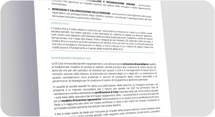 relazioni fra le persone, della valorizzazione degli enti del terzo settore, dei servizi offerti alla comunità ed al quartiere, nonché in termini di riqualificazione urbana; • TUTELA DELL’AMBIENTE E NEUTRALITÀ CARBONICA - minimizzare l’impatto negativo sulle risorse naturali, attuando un’evoluzione progressiva verso un’economia a zero emissioni di gas climalteranti sia nella propria operatività sia nella realizzazione e gestione dei progetti immobiliari, in linea con gli obiettivi europei, nazionali e regionali di neutralità climatica e di transizione ecologica; • GOVERNANCE, SVILUPPO IMMOBILIARE E RIGENERAZIONE URBANA - promuovere soluzioni che generino un impatto positivo nel settore dello sviluppo e della rigenerazione immobiliare; • BENESSERE E VALORIZZAZIONE DELLE PERSONE - promuovere il coinvolgimento dei propri dipendenti nel perseguimento degli obiettivi societari, nonché per il perseguimento del loro benessere lavorativo, personale e familiare. CODICE ETICO Il Codice Etico è stato ideato e costruito per raccontare la missione e i valori a cui Redo, quale società benefit, ha inteso ispirarsi, e per delineare un sistema di regole cui devono attenersi tutti coloro che operano nell’interesse della Società, qualunque sia il rapporto, anche di natura temporanea, che li lega alla stessa. Parte integrante del Modello 231 adottato dalla Società, il Codice Etico trova la sua fonte ispiratrice nel sentire comune che ha unito e unisce le persone che hanno fondato e che lavorano in Redo, e che si traduce in un insieme di ragioni ideali che costituiscono il fondamento e il senso della missione della SGR. Società benefit e Network B Corp Le B Corp e le società benefit rappresentano una vera e propria evoluzione di paradigma rispetto al tradizionale modello di società di capitali, poiché puntano alla creazione di valore sia per gli azionisti che per altri portatori di interessi: per questo il CDA e il management di Redo hanno il compito, sancito nello Statuto, di bilanciare gli interessi degli uni e degli altri. Le implicazioni di questo cambiamento sono profonde in termini di protezione della mission aziendale e di governance, di strategia per la creazione di valore, di trasparenza e gestione aziendale. In qualità di società benefit fin dalla sua costituzione, Redo esprime un impegno concreto nel presente e lo intende consolidare per il futuro: per questo nel 2021 ha terminato l’iter di valutazione e verifica ottenendo la certificazione B Corp rilasciata da B Lab, che è volta a valutare – sulla base dello standard del B Impact Assessment (BIA) – la possibilità di ricondurre le attività ad un modello di business rigenerativo nell’ecosistema in cui opera. Con la certificazione B Corp, Redo si è aggiunta alle oltre 140 realtà certificate in Italia e alle 4.600 nel mondo, risultando la principale società operante nel settore real estate italiano. Il BIA è stato scelto da Redo per misurare gli impatti della propria attività, come richiesto dalla normativa italiana delle società benefit, nelle seguenti aree: Ambiente, Governance, Lavoratori, altri Stakeholder (Comunità e Clienti). Il BIA integra inoltre i princìpi del Global Compact delle Nazioni Unite per facilitare l’identificazione e la valutazione di azioni aziendali significative ai fini degli obiettivi di sviluppo sostenibile (SDGs) di cui all’“Agenda 2030 per lo sviluppo sostenibile” adottata dall’Assemblea generale delle Nazioni Unite il 25 settembre 20158. 8 In totale, l’Assemblea ha individuato 17 SDGs, ai quali sono associate una serie di azioni finalizzate al loro raggiungimento, per un totale di n. 169 target. Per maggiori informazioni si veda: https://sdgs.un.org/goals 14