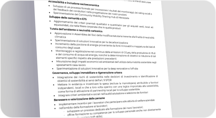 5. Obiettivi 2022 Redo, anno dopo anno, progetta e realizza un piano di miglioramento della propria performance di sostenibilità: dietro le soluzioni che proponiamo c’è una costante attitudine all’innovazione e allo sviluppo. Vogliamo fare la differenza e distinguerci anche attraverso un approccio aperto e collaborativo: la nostra vocazione è, infatti, estendere il nostro impatto positivo dedicato all’affordable housing ai servizi complementari all’abitare, connettendo i nostri partner e basandoci sul connubio tra tecnologie avanzate e innovazione sociale, il tutto al fine di assicurare benessere alle persone. Accessibilità e inclusione socioeconomica • Sviluppo di un processo formale per incorporare i risultati dei monitoraggi, dei rating sociali e dei feedback dei conduttori nella progettazione dei nostri prodotti • Sperimentazione del Community Mobility Sharing Hub di Merezzate Sviluppo delle comunità e ETS • Aggiornamento dei criteri premiali qualitativi e quantitativi per gli acquisti verdi, locali ed equosolidali, sia nelle filiere corporate che in quelle product Tutela dell’ambiente e neutralità carbonica • Approvazione in Assemblea dei Soci della modifica statutaria inerente alla finalità di neutralità climatica • Sperimentazione di soluzioni innovative per la decarbonizzazione • Incremento della porzione di energia proveniente da fonti rinnovabili e mappatura dei dati di consumo degli asset • Monitoraggio e registrazione nel continuo delle emissioni di CO eq, della produzione di rifiuti 2 e del consumo di acqua ed energia, nonché la determinazione di obiettivi di riduzione di tali elementi specifici rispetto alle prestazioni precedenti • Misurazione degli impatti economici ed ambientali dell’utilizzo della mobilità sostenibile negli spostamenti casa-lavoro • Sperimentazione di soluzioni innovative per la deep renovation e l’off-site Governance, sviluppo immobiliare e rigenerazione urbana • Integrazione dei rischi di sostenibilità nelle decisioni di investimento e identificazione di obiettivi di sostenibilità ai sensi dell’art. 9 SFDR • Mettere in evidenza e incentivare la spesa (esclusa la manodopera) attribuibile a fornitori indipendenti, locali e che a loro volta operino con una logica improntata alla sostenibilità, come forma di attivazione di partnership locali per lo sviluppo sostenibile • Integrare criteri ambientali e sociali nell’audit/valutazione e selezione dei fornitori Benessere e valorizzazione delle persone • Implementare incentivi per i lavoratori che partecipano alle attività di welfare aziendale • nell’ambito della formazione ai lavoratori: · sviluppare un processo dedicato alla formazione dei nuovi lavoratori; · offrire formazione su competenze per lo sviluppo personale anche non direttamente legate alla carriera (soft skills); · offrire incentivi per la formazione continua; · creare percorsi per la selezione interna per posizioni di alto livello. • Integrare princìpi e pratiche ambientali e sociali dell’azienda nella formazione continua di lavoratori e dirigenti e la definizione di obiettivi sociali e ambientali individuali o di gruppo • promuovere prodotti e pratiche rispettose dell’ambiente, anche sfruttando lo smart working, fornendo ai lavoratori soluzioni in materia di tutela dell’ambiente da remoto • Integrare e sistematizzare degli incentivi all’utilizzo della mobilità sostenibile negli spostamenti casa-lavoro. 33