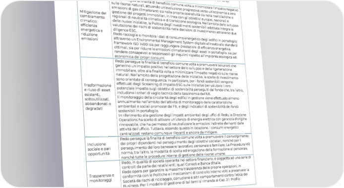 TEMA MODALITÀ DI GESTIONE MATERIALE Redo persegue la finalità di beneficio comune volta ad offrire abitazioni a canoni accessibili alle persone che non riescono ad accedere al libero mercato. Nell’ambito dello sviluppo delle nuove iniziative e della gestione ordinaria dei fondi, l’assegnazione delle abitazioni viene gestita in linea con i requisiti reddituali definiti Accessibilità dalle diverse convenzioni stipulate con i comuni di riferimento. In ogni caso, il economica canone della locazione non può superare 1/3 del reddito netto del nucleo familiare. Il monitoraggio dell’affordability delle iniziative viene effettuato almeno annualmente nell’ambito dell’attività di monitoraggio delle caratteristiche ambientali e sociali promosse dal FIL e degli indicatori di sostenibilità dei fondi sostenibili in portafoglio. Redo persegue la finalità di beneficio comune volta a minimizzare l’impatto negativo sulle risorse naturali, attuando un’evoluzione progressiva verso un’economia a zero emissioni di gas climalteranti sia nella propria operatività sia nella realizzazione e Mitigazione del gestione dei progetti immobiliari, in linea con gli obiettivi europei, nazionali e cambiamento regionali di neutralità climatica e di transizione ecologica. Nell’ambito dello sviluppo climatico: delle nuove iniziative, la Politica degli investimenti sostenibili adottata integra la efficienza valutazione dei rischi di sostenibilità nelle decisioni di investimento attraverso due energetica e diligence ESG. riduzione Redo raccoglie e monitora i dati di consumo energetico degli edifici in portafoglio emissioni attraverso un Environmental Management System digitale allineato allo standard framework ISO 14001 sia per raggiungere prestazioni di efficienza energetica ottimali, sia per ridurre le emissioni climalteranti degli asset in portafoglio, sia per rendere consapevoli e responsabili gli inquilini rispetto all’impronta ecologica ed economica dei propri consumi. Redo persegue la finalità di beneficio comune volta a promuovere soluzioni che generino un impatto positivo nel settore dello sviluppo e della rigenerazione immobiliare, oltre alla finalità volta a minimizzare l’impatto negativo sulle risorse naturali. Nell’ambito della progettazione delle iniziative, le scelte di investimento sono orientate di conseguenza. In particolare, per i fondi sostenibili vengono Trasformazione effettuati degli Screening di impatto ESG sulle iniziative per valutare il loro e riuso di asset potenziale impatto sugli obiettivi di sostenibilità perseguiti dal fondo che, tra l’altro, esistenti, includono i criteri di vaglio tecnico della tassonomia dell’UE. sottoutilizzati, Il monitoraggio della circolarità degli edifici in gestione viene effettuato almeno abbandonati o annualmente nell’ambito dell’attività di monitoraggio delle caratteristiche degradati ambientali e sociali promosse dal FIL e degli indicatori di sostenibilità dei fondi sostenibili in portafoglio. In riferimento alla gestione degli impatti ambientali degli uffici di Redo, la Direzione Operations ha scelto di attivare un’utenza di energia elettrica con garanzia d’origine rinnovabile, che ha permesso di neutralizzare le emissioni indirette derivanti dalle attività dell’ufficio. Tuttavia, essendo questo in locazione, i consumi energetici centralizzati restano comunque rilevanti e ancora da mitigare. Redo persegue la finalità di beneficio comune volta a promuovere il coinvolgimento Inclusione dei propri dipendenti nel perseguimento degli obiettivi societari, nonché per il sociale e pari perseguimento del loro benessere lavorativo, personale e familiare. La Procedura HR opportunità norma, tra l’altro, le modalità di scelta ed erogazione della formazione al personale, nonché tutte le procedure interne di gestione delle risorse umane. Redo, in qualità di società operante nel settore finanziario, è soggetta ad una serie di controlli da parte dei relativi enti, quali Consob e Banca d’Italia. Trasparenza e Redo opera per garantire la massima trasparenza delle proprie operazioni, in monitoraggi conformità con le Politiche e i meccanismi di controllo interno volti a preservare la Società da rischi di riciclaggio, corruzione e altri comportamenti contro l’etica del Business. Per il modello di gestione di tali temi si rimanda al Cap. 2.1. Profilo societario. 33