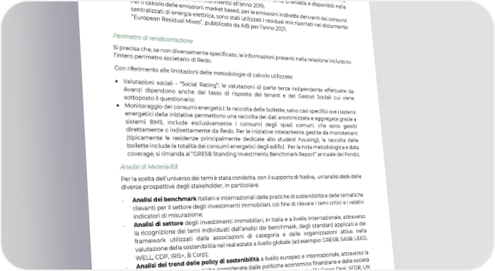o Emissioni dirette (Scope 1): le emissioni legate al consumo di gas naturale centralizzato per il riscaldamento dell’ufficio sono state determinate utilizzando come fattori di emissione quelli riportati nella Tabella dei parametri standard nazionali, pubblicata dal Ministero Italiano per l’Ambiente, per l’anno 2021; o Emissioni indirette (Scope 2): le emissioni indirette corrispondono ai consumi di energia elettrica dell’ufficio di Redo; le emissioni legate ai consumi di energia elettrica sono state calcolate secondo l'approccio location based e market based. Per il calcolo delle emissioni location based sono stati utilizzati i fattori per l’Italia presenti nella Tabella 49 - Principali indicatori socio-economici ed energetici, pubblicata da Terna nella sezione Confronti Internazionali, che hanno come fonte Enerdata e disponibili nella loro versione più recente in riferimento all’anno 2019. Per il calcolo delle emissioni market based, per le emissioni indirette derivanti dai consumi centralizzati di energia elettrica, sono stati utilizzati i residual mix riportati nel documento “European Residual Mixes”, pubblicato da AIB per l’anno 2021. Perimetro di rendicontazione Si precisa che, se non diversamente specificato, le informazioni presenti nella relazione includono l’intero perimetro societario di Redo. Con riferimento alle limitazioni delle metodologie di calcolo utilizzate: • Valutazioni sociali - “Social Rating”: le valutazioni di parte terza indipendente effettuate da Avanzi dipendono anche dal tasso di risposta dei tenant e dei Gestori Sociali cui viene sottoposto il questionario; • Monitoraggio dei consumi energetici: la raccolta delle bollette, salvo casi specifici ove i sistemi energetici delle iniziative permettono una raccolta dei dati anonimizzata e aggregata grazie a sistemi BMS, include esclusivamente i consumi degli spazi comuni, che sono gestiti direttamente o indirettamente da Redo. Per le iniziative interamente gestite da monotenant (tipicamente le residenze principalmente dedicate allo student housing), la raccolta delle bollette include la totalità dei consumi energetici degli edifici. Per la nota metodologica e data coverage, si rimanda al “GRESB Standing Investments Benchmark Report” annuale del Fondo; Analisi di Materialità Per la scelta dell’universo dei temi è stata condotta, con il supporto di Nativa, un’analisi desk delle diverse prospettive degli stakeholder, in particolare: - Analisi dei benchmark italiani e internazionali delle pratiche di sostenibilità e delle tematiche rilevanti per il settore degli investimenti immobiliari, col fine di rilevare i temi critici e i relativi indicatori di misurazione; - Analisi di settore degli investimenti immobiliari, in Italia e a livello internazionale, attraverso la ricognizione dei temi individuati dall’analisi dei benchmark, degli standard applicati e dei framework utilizzati dalle associazioni di categoria e dalle organizzazioni attive nella valutazione della sostenibilità nel real estate a livello globale (ad esempio: GRESB, SASB, LEED, WELL, CDP, IRIS+, B Corp); - Analisi dei trend delle policy di sostenibilità a livello europeo e internazionale, attraverso la ricognizione delle tematiche considerate dalle politiche economico finanziarie e dalle società di rating, dalle istituzioni governative e sopranazionali (ad esempio: EU Green Deal, SFDR, UN Global Compact, C40). La Società ha identificato stakeholder chiave con cui avviare il dialogo sulla rilevanza dei temi materiali, e sulla base delle loro aspettative, ha avviato attività di ascolto attivo e di coinvolgimento nel 2022: 31