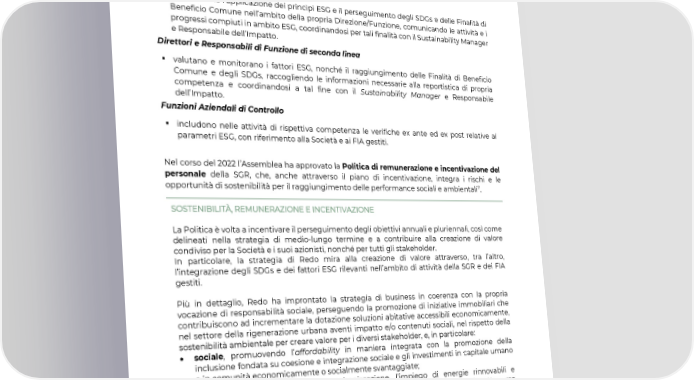 supporta le attività di reporting, di rendicontazione non finanziaria e di relazioni pubbliche dell’Amministratore Delegato; agisce da punto di riferimento per le tematiche ESG e cura il dialogo e i rapporti con gli stakeholder interni ed esterni; propone e coordina le implementazioni operative da effettuare sulla normativa interna; redige la reportistica periodica da presentare al Consiglio di Amministrazione e al Collegio sindacale, quale, a esempio, la Relazione di Impatto, e collabora con le strutture aziendali competenti nella predisposizione della reportistica non finanziaria della SGR e dei FIA gestiti. Direttori e Responsabili di Funzione di prima linea garantiscono l’applicazione dei princìpi ESG e il perseguimento degli SDGs e delle Finalità di Beneficio Comune nell’ambito della propria Direzione/Funzione, comunicando le attività e i progressi compiuti in ambito ESG, coordinandosi per tali finalità con il Sustainability Manager e Responsabile dell’Impatto. Direttori e Responsabili di Funzione di seconda linea valutano e monitorano i fattori ESG, nonché il raggiungimento delle Finalità di Beneficio Comune e degli SDGs, raccogliendo le informazioni necessarie alla reportistica di propria competenza e coordinandosi a tal fine con il Sustainability Manager e Responsabile dell’Impatto. Funzioni Aziendali di Controllo includono nelle attività di rispettiva competenza le verifiche ex ante ed ex post relative ai parametri ESG, con riferimento alla Società e ai FIA gestiti. Nel corso del 2022 l’Assemblea ha approvato la Politica di remunerazione e incentivazione del personale della SGR, che, anche attraverso il piano di incentivazione, integra i rischi e le opportunità di sostenibilità per il raggiungimento delle performance sociali e ambientali7 . SOSTENIBILITÀ, REMUNERAZIONE E INCENTIVAZIONE La Politica è volta a incentivare il perseguimento degli obiettivi annuali e pluriennali, così come delineati nella strategia di medio-lungo termine e a contribuire alla creazione di valore condiviso per la Società e i suoi azionisti, nonché per tutti gli stakeholder. In particolare, la strategia di Redo mira alla creazione di valore attraverso, tra l’altro, l’integrazione degli SDGs e dei fattori ESG rilevanti nell’ambito di attività della SGR e dei FIA gestiti. Più in dettaglio, Redo ha improntato la strategia di business in coerenza con la propria vocazione di responsabilità sociale, perseguendo la promozione di iniziative immobiliari che contribuiscono ad incrementare la dotazione soluzioni abitative accessibili economicamente, nel settore della rigenerazione urbana aventi impatto e/o contenuti sociali, nel rispetto della sostenibilità ambientale per creare valore per i diversi stakeholder, e, in particolare: • sociale, promuovendo l’affordability in maniera integrata con la promozione della inclusione fondata su coesione e integrazione sociale e gli investimenti in capitale umano o in comunità economicamente o socialmente svantaggiate; • ambientale, promuovendo la decarbonizzazione, l’impiego di energie rinnovabili e perseguendo un impatto positivo su biodiversità ed economia circolare, anche attraverso l’uso responsabile delle materie prime, delle risorse idriche, del suolo, in aggiunta al contenimento della produzione di rifiuti e di emissioni di gas a effetto serra; 7 Per maggiori informazioni si rimanda al Capitolo 3.5 della presente relazione. 14