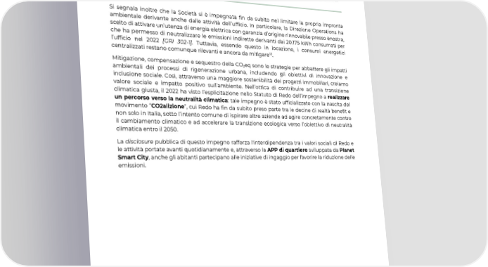 L’importante attività di monitoraggio dei consumi energetici e idrici degli immobili in gestione, l’educazione e l’ingaggio dei residenti, l’attenta pianificazione degli investimenti per la decarbonizzazione e la consapevolezza dei rischi climatici fisici e di transizione sono importanti driver che permettono a Redo di valorizzare il patrimonio immobiliare gestito nel medio-lungo periodo. Ad oggi, l’impronta di carbonio degli asset gestiti risulta essere allineata con gli obiettivi di neutralità climatica europei al 2030 - in base allo scenario di mitigazione del cambiamento climatico entro 1,5°C - ed al 2035 in base allo scenario 2°C. Gli scenari per il settore immobiliare sono resi disponibili da CRREM, il benchmark di riferimento a livello mondiale per la decarbonizzazione degli asset immobiliari in fase operativa e il loro allineamento agli Accordi di Parigi. Si segnala inoltre che la Società si è impegnata fin da subito nel limitare la propria impronta ambientale derivante anche dalle attività dell’ufficio. In particolare, la Direzione Operations ha scelto di attivare un’utenza di energia elettrica con garanzia d’origine rinnovabile presso ènostra, che ha permesso di neutralizzare le emissioni indirette derivanti dai 20.175 kWh consumati per l’ufficio nel 2022 [GRI 302-1]. Tuttavia, essendo questo in locazione, i consumi energetici centralizzati restano comunque rilevanti e ancora da mitigare13 . Mitigazione, compensazione e sequestro della CO eq sono le strategie per abbattere gli impatti 2 ambientali dei processi di rigenerazione urbana, includendo gli obiettivi di innovazione e inclusione sociale. Così, attraverso una maggiore sostenibilità dei progetti immobiliari, creiamo valore sociale e impatto positivo sull’ambiente. Nell’ottica di contribuire ad una transizione climatica giusta, il 2022 ha visto l’esplicitazione nello Statuto di Redo dell’impegno a realizzare un percorso verso la neutralità climatica: tale impegno è stato ufficializzato con la nascita del movimento “CO2alizione”, cui Redo ha fin da subito preso parte tra le decine di realtà benefit e non solo in Italia, sotto l’intento comune di ispirare altre aziende ad agire concretamente contro il cambiamento climatico e ad accelerare la transizione ecologica verso l’obiettivo di neutralità climatica entro il 2050. La disclosure pubblica di questo impegno rafforza l'interdipendenza tra i valori sociali di Redo e le attività portate avanti quotidianamente e, attraverso la APP di quartiere sviluppata da Planet Smart City, anche gli abitanti partecipano alle iniziative di ingaggio per favorire la riduzione delle emissioni. 13 Per il dettaglio dei consumi ed emissioni si rimanda alle tabelle in Appendice 2. 22