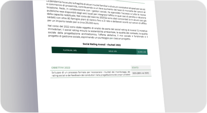 Titolo di studio 26% 20% 17% 7% 5% 25% Maturità Licenza media Laurea o titolo post laurea Qualifica professionale Licenza elementare Altro La pandemia ha acuito la fragilità di alcuni nuclei familiari e di alcuni conduttori di spazi per servizi e commercio di prossimità, contribuendo a un lieve aumento dei tassi di morosità dei canoni di locazione. Redo, in collaborazione con i gestori sociali, ha agevolato l’accesso a tutte le risorse pubbliche rese disponibili dagli enti locali per integrare l’affitto in quei casi di perdita o riduzione della capacità reddituale. Nel corso del biennio 2021/22 sono stati concordati (e in alcuni casi già saldati) con oltre 80 famiglie piani di rientro fino a 21 rate e deliberati sconti sui canoni di affitto per un importo totale pari a circa 215.000 euro. Nel corso del 2022 sono state oggetto di analisi da parte del social rating di Avanzi 12 iniziative immobiliari. Il social rating misura la sostenibilità ambientale, la qualità del contesto, la qualità sociale della progettazione architettonica, l’offerta abitativa, il mix sociale e funzionale e il progetto di gestione sociale, esprimendo un punteggio per ciascun progetto. Social Rating Avanzi - risultati 2022 PLATINUM; 34% GOLD; 53% SILVER; 13% OBIETTIVI 2022 STATO Sviluppo di un processo formale per incorporare i risultati dei monitoraggi, dei 100% (80% nel 2021) rating sociali e dei feedback dei conduttori nella progettazione dei propri prodotti 19