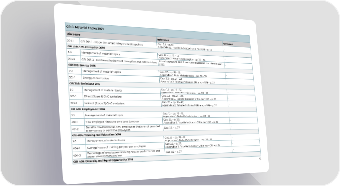 GRI 3: Material Topics 2021 Disclosure Reference Omission 204-1 GRI 204-1 - Proportion of spending on local suppliers Cap. 2.4 – p. 24; - Appendice 2. Tabelle indicatori GRI e non GRI – p. 36 GRI 205: Anti-corruption 2016 3-3 Management of material topics Cap. 1.2 – pp. 10 – 12; - Appendice 1. Nota Metodologica – pp. 30 - 33 205-3 GRI 205-3 - Confirmed incidents of corruption and actions taken Non si segnalano casi di corruzione accertati nel biennio 2021- - 2022 GRI 302: Energy 2016 3-3 Management of material topics Cap. 1.2 – pp. 10 – 12; - Appendice 1. Nota Metodologica – pp. 30 - 33 302-1 Energy consumption Cap. 2.3. – pp. 21 – 22; - Appendice 2. Tabelle indicatori GRI e non GRI – p. 37 GRI 305: Emissions 2016 3-3 Management of material topics Cap. 1.2 – pp. 10 – 12; - Appendice 1. Nota Metodologica – pp. 30 - 33 305-1 Direct (Scope 1) GHG emissions Cap. 2.3. – pp. 21 – 22; - Appendice 2. Tabelle indicatori GRI e non GRI – p. 37 305-2 Indirect (Scope 2) GHG emissions Cap. 2.3. – pp. 21 – 22; - Appendice 2. Tabelle indicatori GRI e non GRI – p. 37 GRI 401: Employment 2016 3-3 Management of material topics Cap. 1.2 – pp. 10 – 12; - Appendice 1. Nota Metodologica – pp. 30 - 33 401-1 New employee hires and employee turnover Cap. 2.5. – p. 26; - Appendice 2. Tabelle indicatori GRI e non GRI – p. 36 401-2 Benefits provided to full-time employees that are not provided Cap. 2.5. – p. 27 - to temporary or parttime employees GRI 404: Training and Education 2016 3-3 Management of material topics Cap. 1.2 – pp. 10 – 12; - Appendice 1. Nota Metodologica – pp. 30 - 33 404-1 Average hours of training per year per employee Cap. 2.5. – p. 27; - Appendice 2. Tabelle indicatori GRI e non GRI – p. 36 404-3 Percentage of employees receiving regular performance and Cap. 2.5. – p. 27 - career development reviews GRI 405: Diversity and Equal Opportunity 2016 42