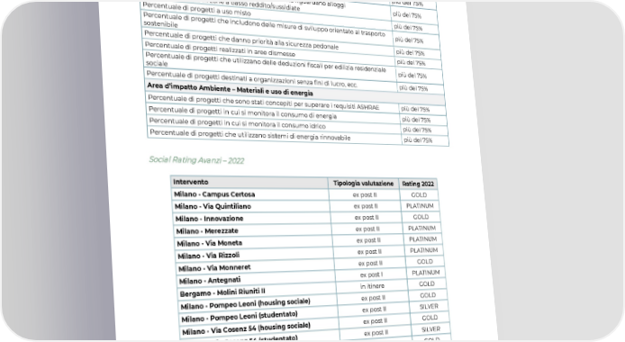 Indicatori non GRI: B Impact Assessment 2022 Business Model d’impatto Disclosure Area d’impatto Ambiente – Formazione e Collaborazione Percentuale di progetti che utilizzano un processo di progettazione integrata più del 75% Percentuale di progetti che utilizzano un processo di progettazione collaborativa dal 50% al 75% Area d’impatto Ambiente – Comunità Percentuale di progetti situati in quartieri a basso o moderato reddito più del 75% Percentuale dei progetti di costruzione edilizia che riguardano alloggi più del 75% popolari/abitazioni in zone a basso reddito/sussidiate Percentuale di progetti a uso misto più del 75% Percentuale di progetti che includono delle misure di sviluppo orientato al trasporto più del 75% sostenibile Percentuale di progetti che danno priorità alla sicurezza pedonale più del 75% Percentuale di progetti realizzati in aree dismesse più del 75% Percentuale di progetti che utilizzano delle deduzioni fiscali per edilizia residenziale più del 75% sociale Percentuale di progetti destinati a organizzazioni senza fini di lucro, ecc. più del 75% Area d’impatto Ambiente – Materiali e uso di energia Percentuale di progetti che sono stati concepiti per superare i requisiti ASHRAE più del 75% Percentuale di progetti in cui si monitora il consumo di energia più del 75% Percentuale di progetti in cui si monitora il consumo idrico più del 75% Percentuale di progetti che utilizzano sistemi di energia rinnovabile più del 75% Social Rating Avanzi – 2022 Intervento Tipologia valutazione Rating 2022 Milano - Campus Certosa ex post II GOLD Milano - Via Quintiliano ex post II PLATINUM Milano - Innovazione ex post II GOLD Milano - Merezzate ex post II PLATINUM Milano - Via Moneta ex post II PLATINUM Milano - Via Rizzoli ex post II PLATINUM Milano - Via Monneret ex post II GOLD Milano - Antegnati ex post I PLATINUM Bergamo - Molini Riuniti II in itinere GOLD Milano - Pompeo Leoni (housing sociale) ex post II GOLD Milano - Pompeo Leoni (studentato) ex post II SILVER Milano - Via Cosenz 54 (housing sociale) ex post II GOLD Milano - Via Cosenz 54 (studentato) ex post II SILVER Milano - BSC Bicocca (housing sociale) ex post GOLD Milano - BSC Bicocca (studentato) ex post GOLD 38