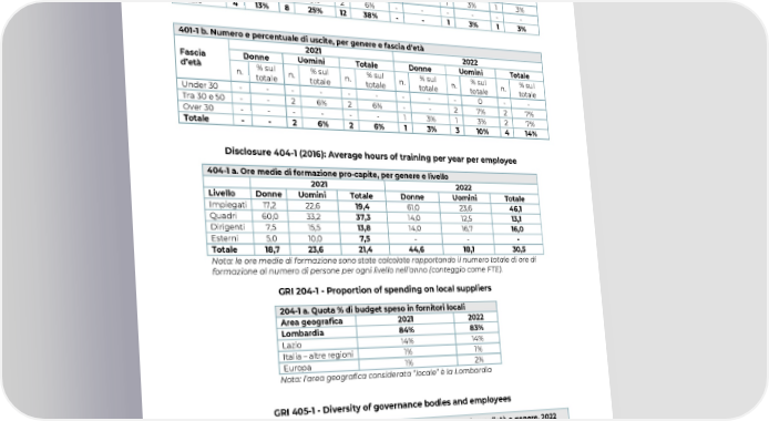 Tabelle GRI – Specific Standards Disclosure 401-1 (2016): New employee hires and employee turnover 401-1 a. Numero e percentuale di nuovi ingressi, per genere e fascia d’età 2021 2022 Fascia Donne Uomini Totale Donne Uomini Totale d’età n. % sul n. % sul n. % sul n. % sul n. % sul n. % sul totale totale totale totale totale totale Under 30 3 9% 4 13% 7 22% - - - - - - Tra 30 e 50 - - 3 9% 3 9% - - 1 3% 1 3% Over 30 1 3% 1 3% 2 6% - - - - - - Totale 4 13% 8 25% 12 38% - - 1 3% 1 3% 401-1 b. Numero e percentuale di uscite, per genere e fascia d’età 2021 2022 Fascia Donne Uomini Totale Donne Uomini Totale d’età n. % sul n. % sul n. % sul n. % sul n. % sul n. % sul totale totale totale totale totale totale Under 30 - - - - - - - - - 0 - - Tra 30 e 50 - - 2 6% 2 6% - - 2 7% 2 7% Over 30 - - - - - - 1 3% 1 3% 2 7% Totale - - 2 6% 2 6% 1 3% 3 10% 4 14% Disclosure 404-1 (2016): Average hours of training per year per employee 404-1 a. Ore medie di formazione pro-capite, per genere e livello 2021 2022 Livello Donne Uomini Totale Donne Uomini Totale Impiegati 17,2 22,6 19,4 61,0 23,6 46,1 Quadri 60,0 33,2 37,3 14,0 12,5 13,1 Dirigenti 7,5 15,5 13,8 14,0 16,7 16,0 Esterni 5,0 10,0 7,5 - - - Totale 18,7 23,6 21,4 44,6 18,1 30,5 Nota: le ore medie di formazione sono state calcolate rapportando il numero totale di ore di formazione al numero di persone per ogni livello nell’anno (conteggio come FTE). GRI 204-1 - Proportion of spending on local suppliers 204-1 a. Quota % di budget speso in fornitori locali Area geografica 2021 2022 Lombardia 84% 83% Lazio 14% 14% Italia – altre regioni 1% 1% Europa 1% 2% Nota: l’area geografica considerata “locale” è la Lombardia GRI 405-1 - Diversity of governance bodies and employees 405-1 a. % dei componenti degli organi di governance suddiviso per fasce d’età e genere, 2022 Fascia d’età Genere Donne Uomini Totale CDA Under 30 - - - Tra 30 e 50 18% 55% 73% Over 50 18% 9% 27% Totale CDA 36% 64% 100% 36