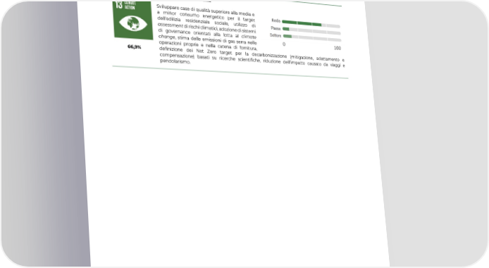 SDG 12 - Consumo e produzione responsabili Ricerca di prodotti e servizi che riducono l’embodied carbon e il fabbisogno di nuova materia prima alle alternative nel mercato, l’adozione di principi di economia circolare, la valutazione dell’impronta ambientale, strategie 66,4% di minimizzazione dei rifiuti. SDG 13 - Agire per il clima Sviluppare case di qualità superiore alla media e a minor consumo energetico per il target dell’edilizia residenziale sociale, utilizzo di assessment di rischi climatici, adozione di sistemi di governance orientati alla lotta al climate change, stima delle emissioni di gas serra nelle operazioni proprie e nella catena di fornitura, 66,9% definizione dei Net Zero target per la decarbonizzazione (mitigazione, adattamento e compensazione) basati su ricerche scientifiche, riduzione dell’impatto causato da viaggi e pendolarismo. 45