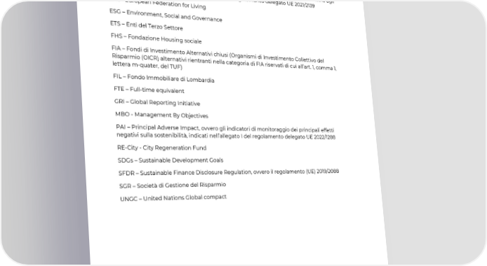 Appendice 5. Abbreviazioni BIA – B Impact Assessment CDA – Consiglio di Amministrazione CRREM - Carbon Risk Real Estate Monitor DNSH – Do Not Significant Harm, ovvero i criteri di vaglio minimo per non arrecare danno agli obiettivi ambientali e sociali dell’UE, normati nel regolamento delegato UE 2021/2139 EFL – European Federation for Living ESG – Environment, Social and Governance ETS – Enti del Terzo Settore FHS – Fondazione Housing sociale FIA – Fondi di Investimento Alternativi chiusi (Organismi di Investimento Collettivo del Risparmio (OICR) alternativi rientranti nella categoria di FIA riservati di cui all’art. 1, comma 1, lettera m-quater, del TUF) FIL – Fondo Immobiliare di Lombardia FTE – Full-time equivalent GRI – Global Reporting Initiative MBO - Management By Objectives PAI – Principal Adverse Impact, ovvero gli indicatori di monitoraggio dei principali effetti negativi sulla sostenibilità, indicati nell’allegato I del regolamento delegato UE 2022/1288 RE-City - City Regeneration Fund SDGs – Sustainable Development Goals SFDR – Sustainable Finance Disclosure Regulation, ovvero il regolamento (UE) 2019/2088 SGR – Società di Gestione del Risparmio UNGC – United Nations Global compact 46